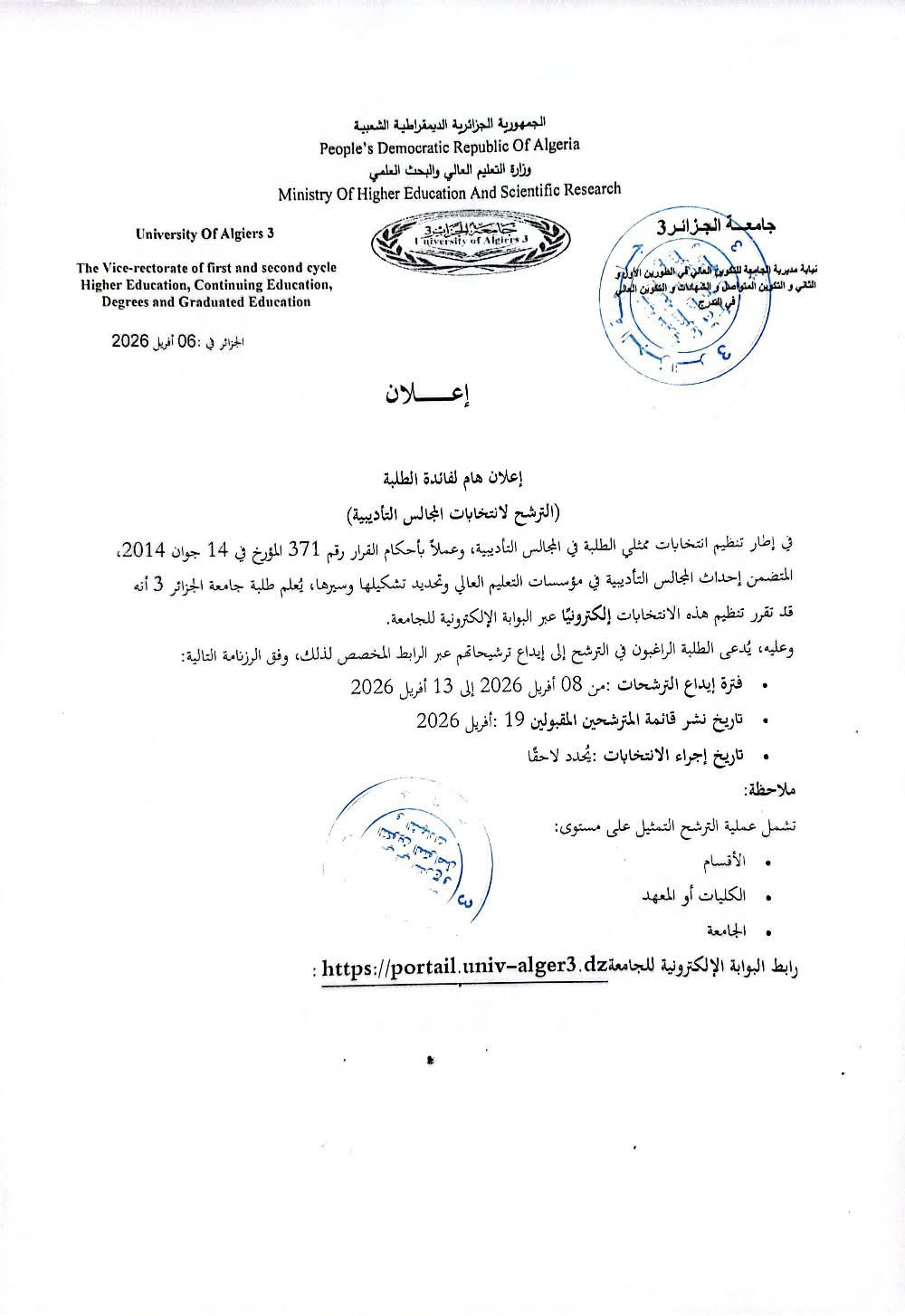 اعلان هام لفائدةالطلبة