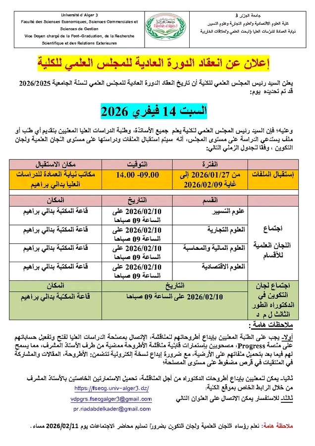 اعلان عن انعقاد الدورة العادية للمجلس العلمية الكلية
