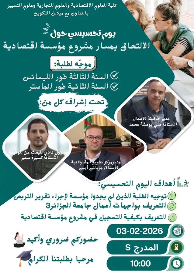 كلية العلوم الاقتصادية والعلوم التجارية وعلوم التسيير بجامعة الجزائر 3، ومخبر العولمة والسياسات الإقتصادية بالتعاون مع المصف الوطني للخبراء المحاسبين تنظم ملتقى علمي وطني هجين(إفتراضي/حضوري)...