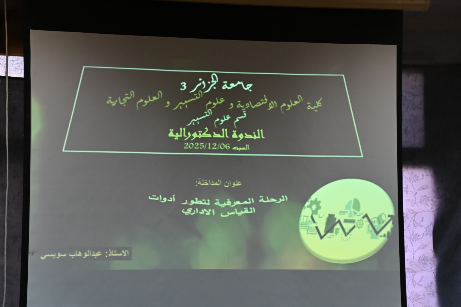 في اطار التكوين في الدكتوراه الطور الثالث بكلية العلوم الاقتصادية والعلوم التجارية وعلوم التسيير بجامعة الجزائر3 ، أشرف الأستاذ الدكتور رياض عبد القادر نائب عميد الكلية المكلف بالدراسات العليا ، بمعيةالدكتور بوعلام بلقاسم نائب العميد المكلف بالبيداغوجيا يوم السبت 6 ديسمبر 2025، على انطلاق الندوات الدكتورالية لمختلف شعب العلوم الاقتصاديةوالعلوم التجاريةوعلوم التسيير، بكل من دالي براهيم و ملحقة بن عكنون. وقد تمّ تأطير هذه الندوات من طرف رؤساء لجان التكوين في الدكتوراه، الاستاذ الدكتور بن موسى كمال مسؤول شعبة العلوم المالية والمحاسبة، الاستاذ الدكتور سويسي عبد الوهاب مسؤول شعبة علوم التسيير، الاستاذة الدكتورة فتيحة بلحاج، مسؤولة شعبة العلوم الاقتصادية، و الاستاذ الدكتور محمدي عز الدين مسؤول شعبة العلوم التجارية.