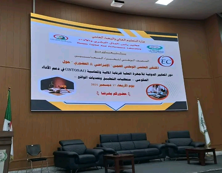 🔹 شهدت كلية العلوم الاقتصادية والتجارية وعلوم التسيير بجامعة يوم الأربعاء 17 ديسمبر 2025، بمقرها بدالي ابراهيم، إنطلاق اشغال الملتقى العلمي الوطني حول “دور المعايير الدولية للأجهزة العليا للرقابة المالية والمحاسبة ( INTOSAI ) في دعم الأداء الحكومي- متطلبات التطبيق وتحديات الواقع-