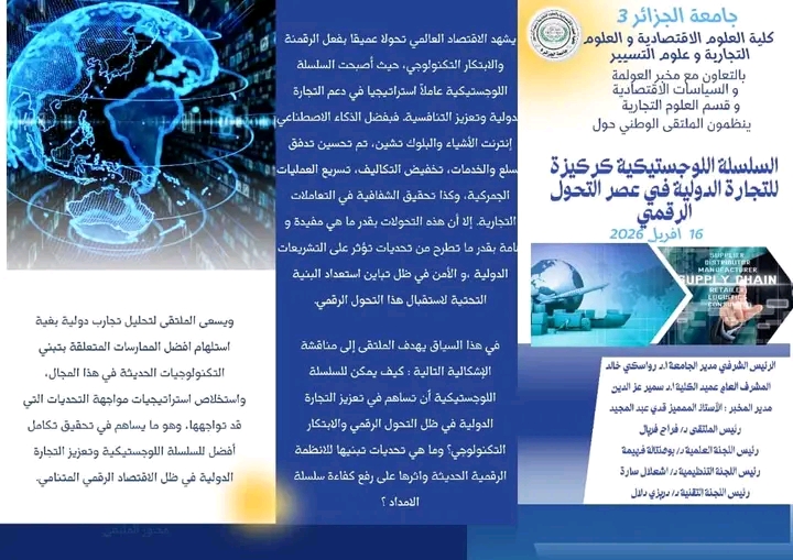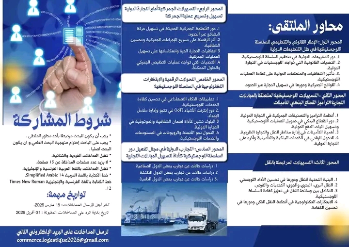 📢 يعلن مخبر العولمة و السياسات الاقتصادية، و قسم العلوم التجارية عن تنظيم ملتقى علمي وطني حول: “#السلسلة اللوجستية كركيزة للتجارة الدولية في عصر التحول الرقمي”
