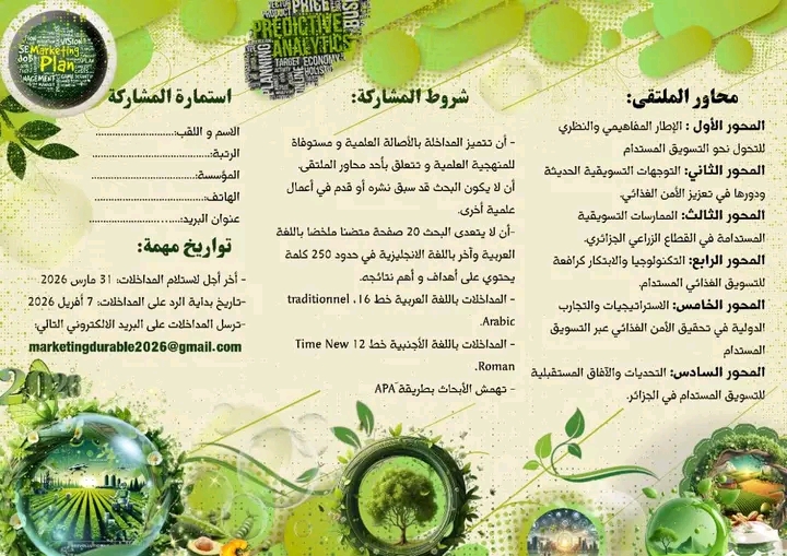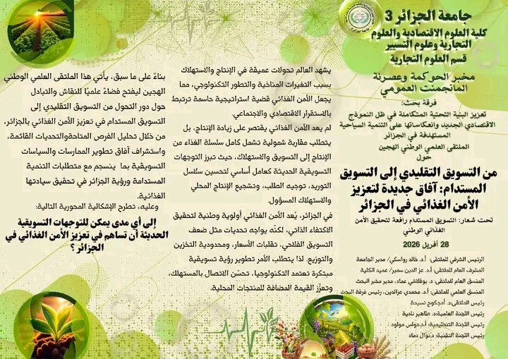✍️تنظم كلية العلوم الاقتصادية والعلوم التجارية وعلوم التسيير، بالتعاون مع مخبر الحوكمة وعصرنة المناجمنت العمومي ملتقى وطني هجين بعنوان : « من التسويق التقليدي إلى التسويق المستدام: آفاق جديدة لتعزيز الأمن الغذائي في الجزائر».