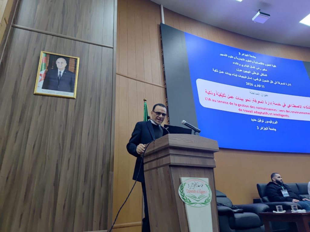 وشهدت الجلسة العلمية الأولى مداخلة افتتاحية للأستاذ نوفيل حديد، بعنوان “الذكاء الاصطناعي في خدمة إدارة المعرفة: نحو بيئات عمل تكيفية وذكية”