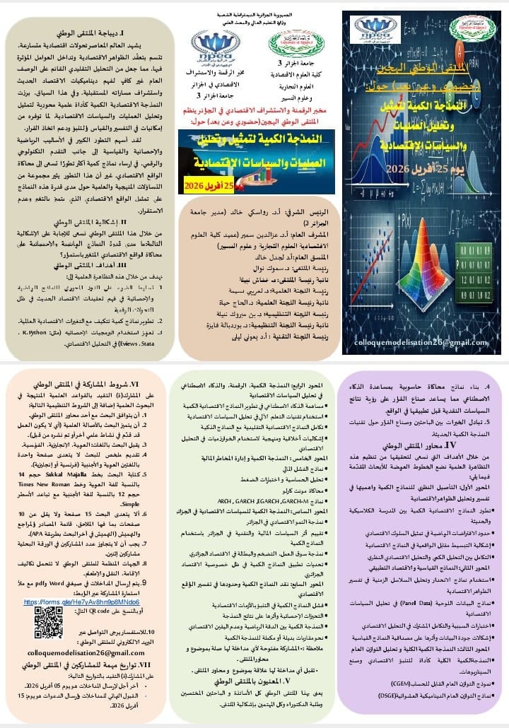 يعلن مخبر الرقمنة والاستشراف الاقتصادي في الجزائر، بكلية العلوم الاقتصادية والتجارية وعلوم التسيير بجامعة الجزائر3، عن تنظيم الملتقى العلمي الوطني حول:
