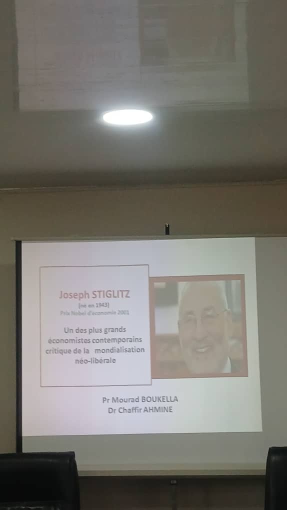 ومن جهته تناول الاستاذ بوكلة مراد في مداخلته السيرة العلمية والفكرية لجوزيف استغليتز، الذي يعد من ابرز الاقتصاديين المعاصرين واكثرهم تاثيرا في الفكر النقدي للرأسمالية كما اشار الى مساره الاكاديمي حيث درس بين 1965 و 1966 في جامعة كامبريدج قبل ان يعود سنة 1967 الى الولايات المتحدة لمناقشة اطروحته في معهد MIT تحت اشراف روبرت سولو الحائز على نوبل واستعرض كذلك المناصب التي تقلدها في جامعات ييل وبرينستون واكسفورد وكولومبيا اضافة الى توليه رئاسة مجلس المستشارين الاقتصاديين بالبيت الابيض ومنصب كبير الاقتصاديين في البنك الدولي، وتتويجه بجائزة