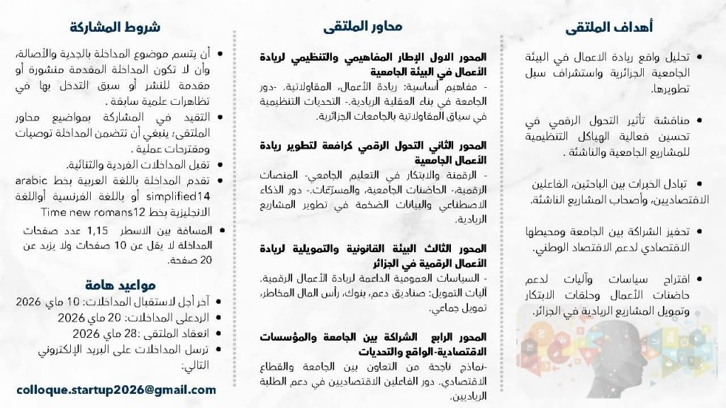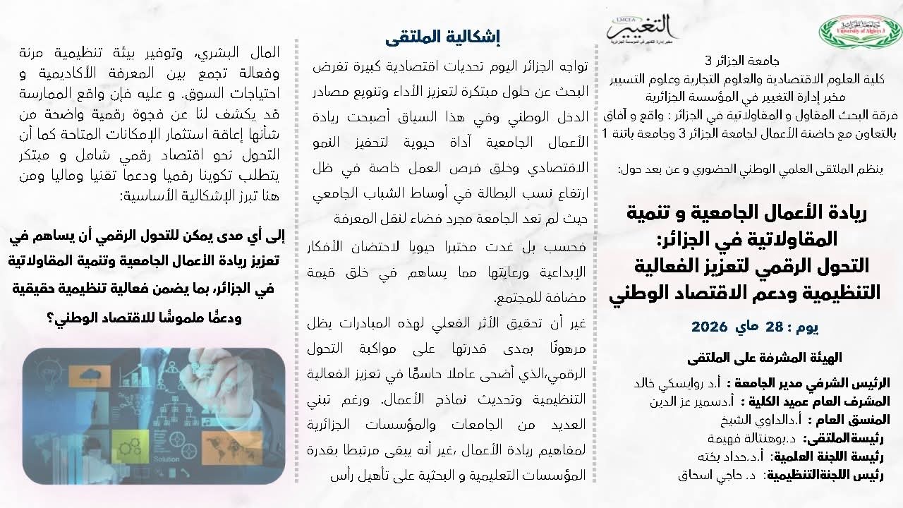 يعلن مخبر ادارة التغيير في المؤسسة الجزائرية، بالتعاون مع كلية العلوم الاقتصادية والتجارية وعلوم التسيير بجامعة الجزائر 3، حاضنة الأعمال بجامعة الجزائر 3، جامعة باتنة1 عن تنظيم ملتقى وطني حضوري وعن بُعد بعنوان: