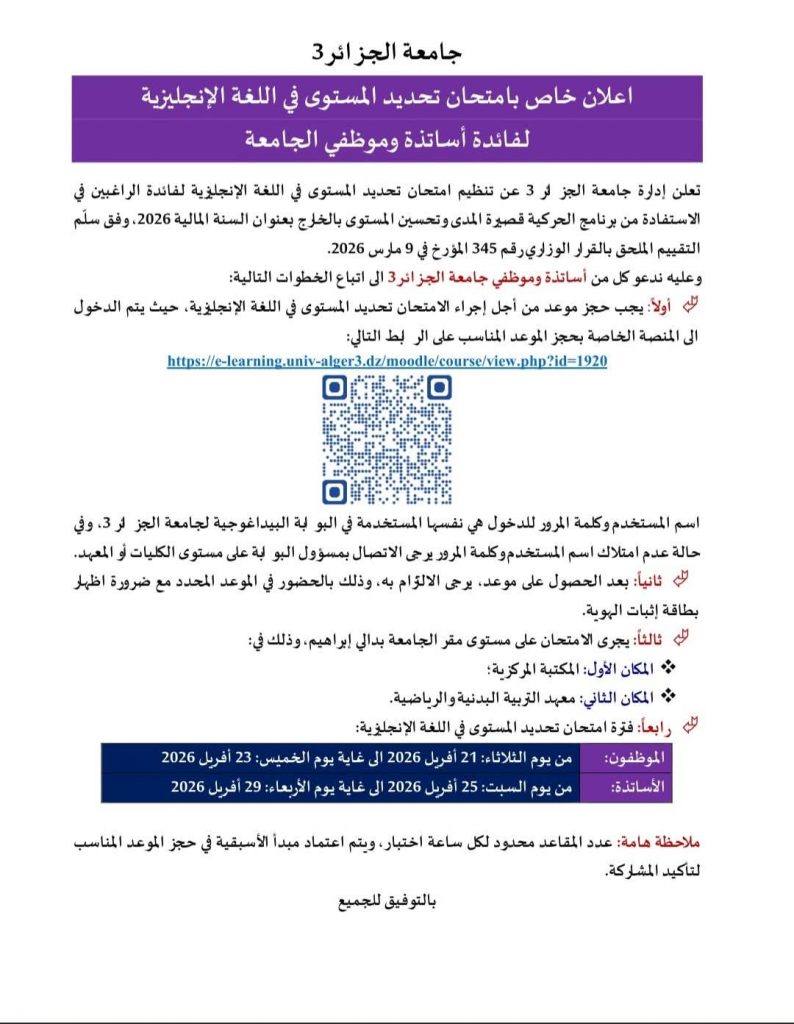 إعلان خاص بامتحان تحديد المستوى في اللغة الإنجليزية لفائدة أساتذة وموظفي الجامعة تصفّح المقالات دعوة انتخابات المجلس العلمي