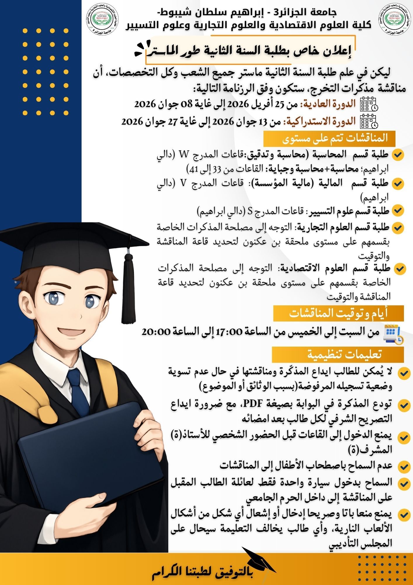 من أجل البدء في اجراءات المناقشة يتوجب على الطلبة إيداع المذكرة على مستوى البوابة الإلكترونية للجامعة (فضاء الطالب)، وكذا ايداع التصريح الشرفي بعد امضائه؛